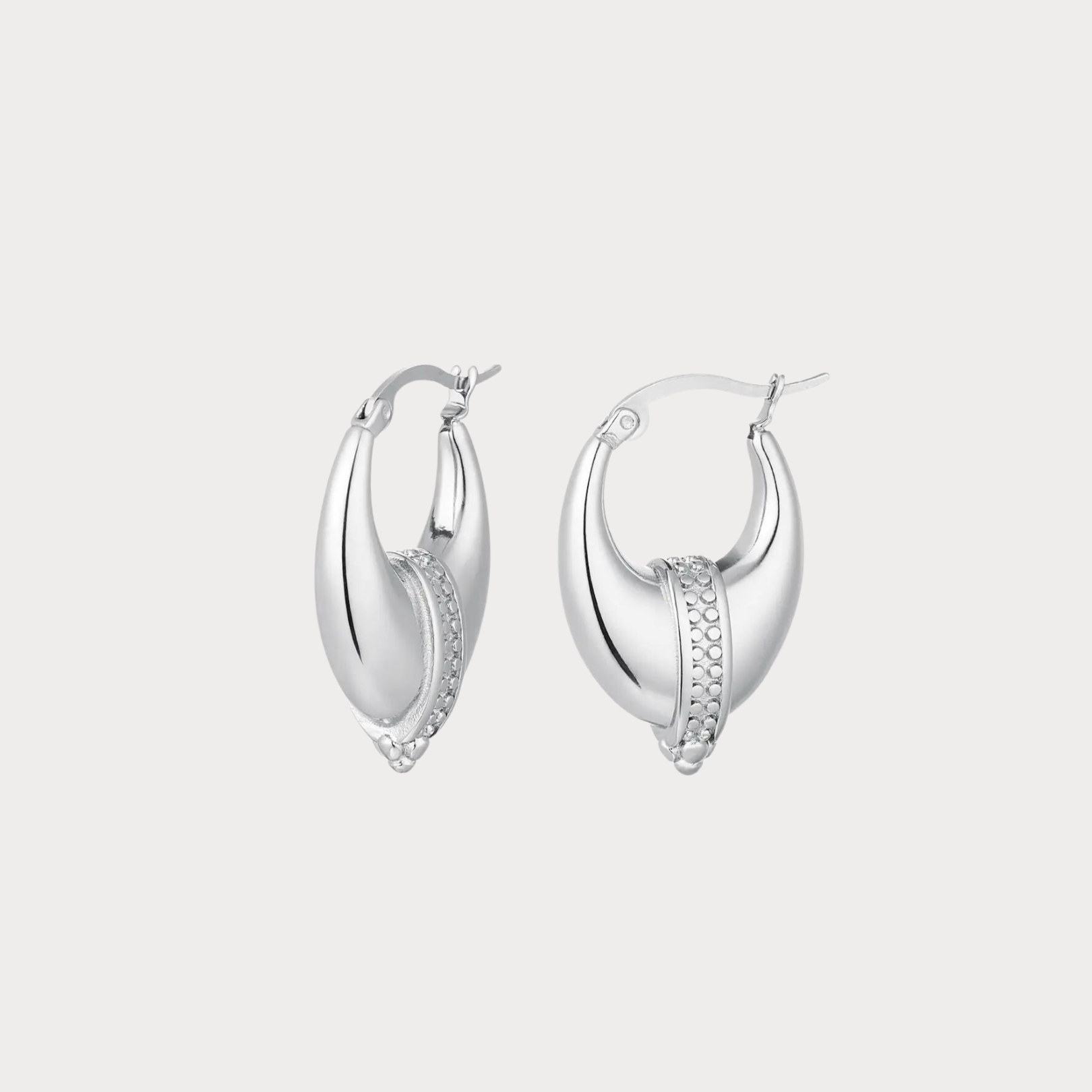 Small hoop thinner at the top with a heavier oval shape and a detail in the middle of the hoop. Incredibly suitable for both a classy look as well as a edgier one. Has a boho feel to it without being too overwhelming. (These earrings are more to the heavier side, so if your ears are sensitive or can't handle heavier earrings please skip these)
